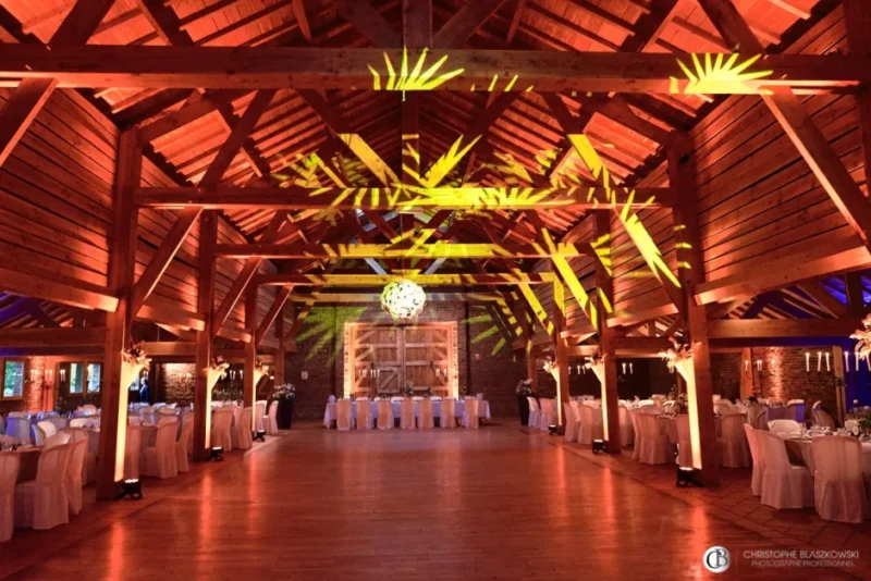 La grange monumentale – 1 000 m² modulables, faits de bois, de briques, de pierres et de verre – offre un cadre spectaculaire pour un mariage de grande envergure, tout en conservant une atmosphère chaleureuse et mémorable.